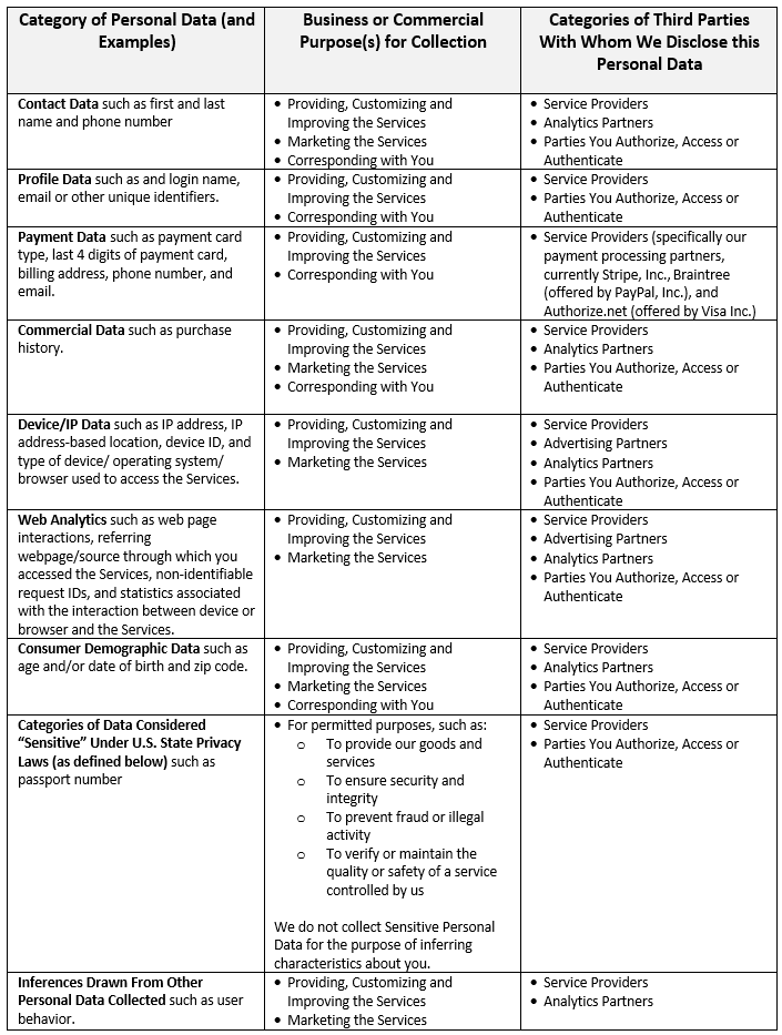 The “Categories of Personal Data We Collect” section above details the Personal Data that we collect from you.